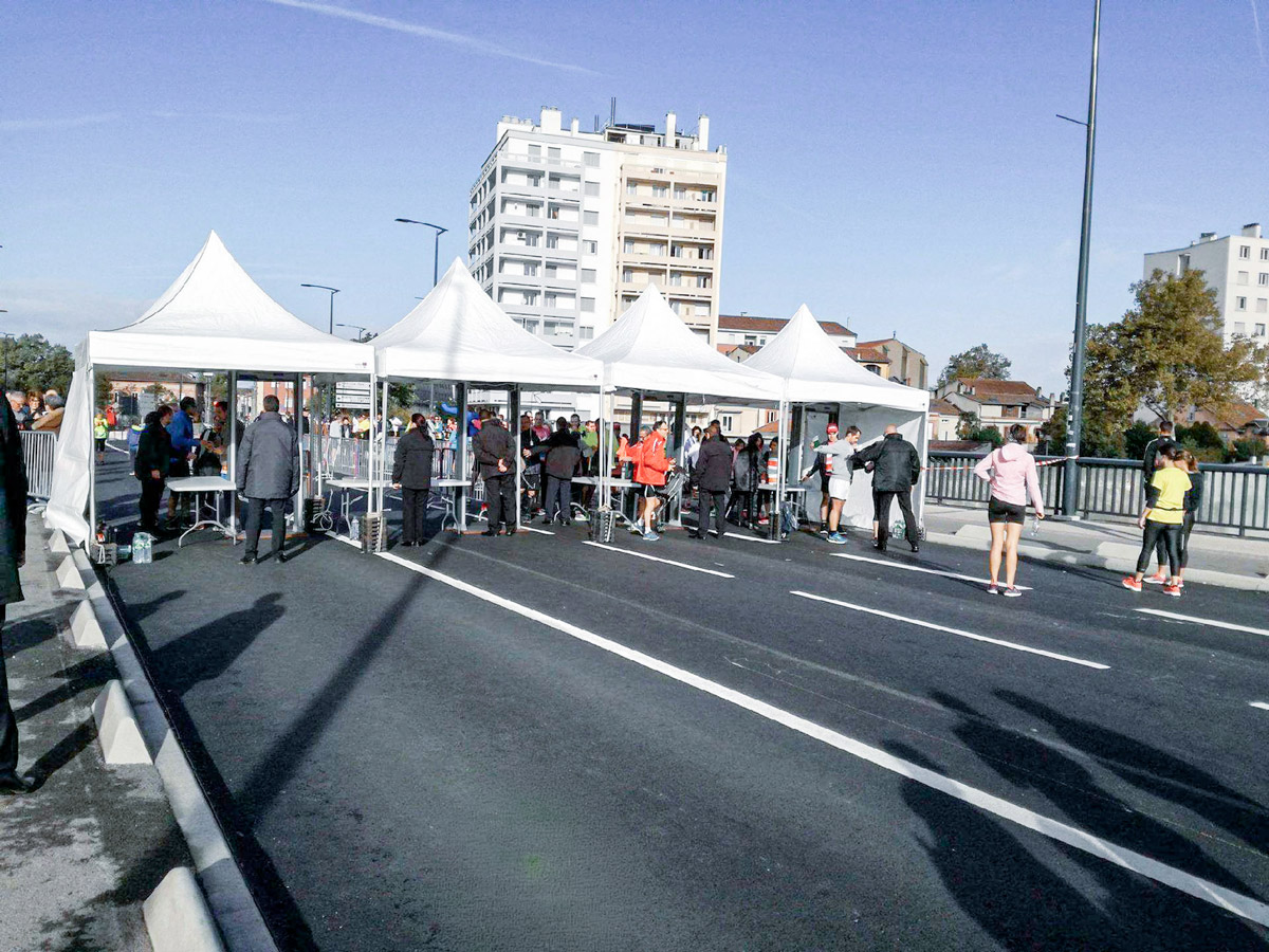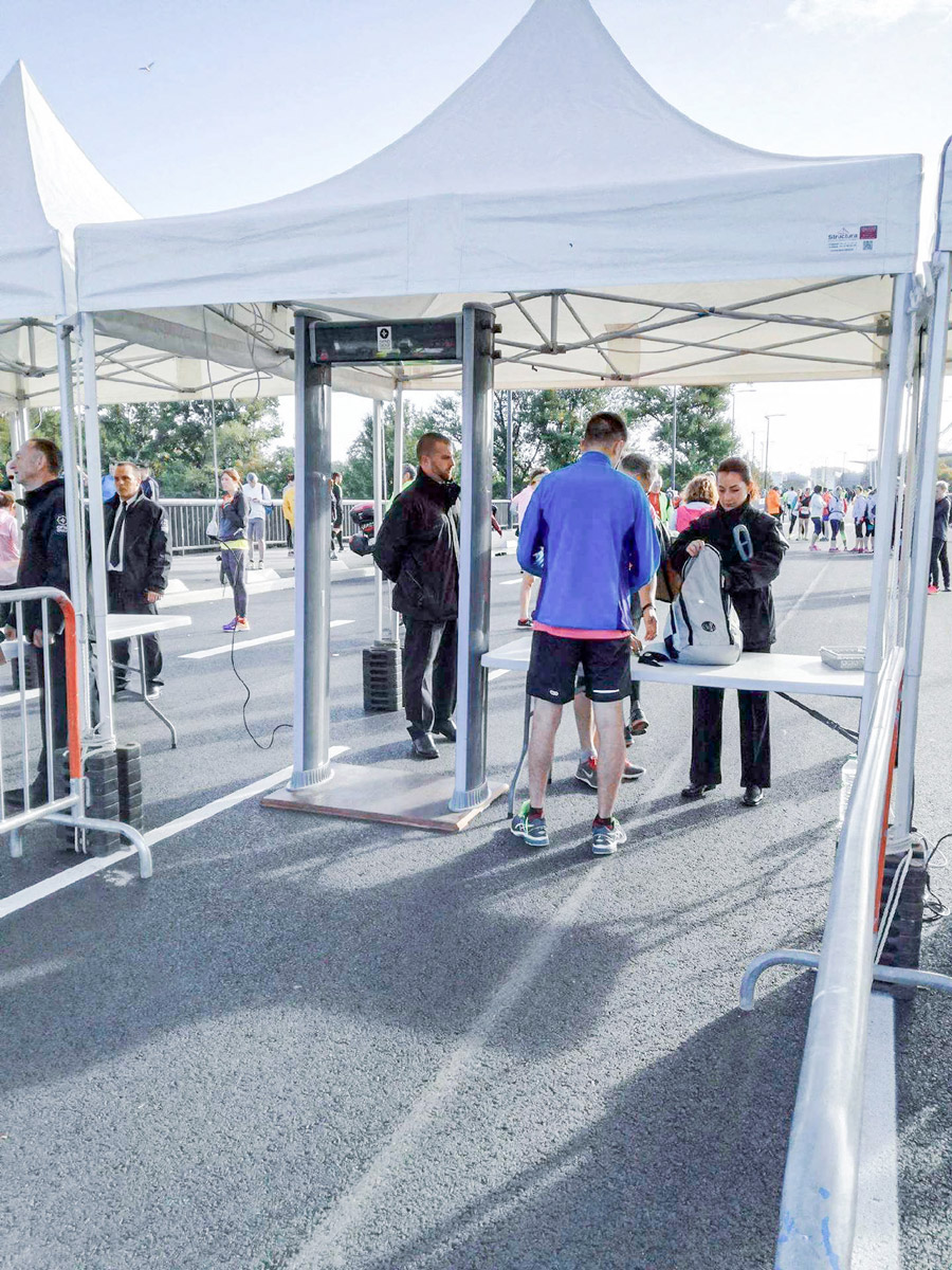3 pagodes pliables pour un départ de marathon, portique de sécurité.